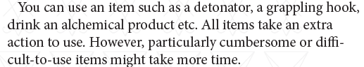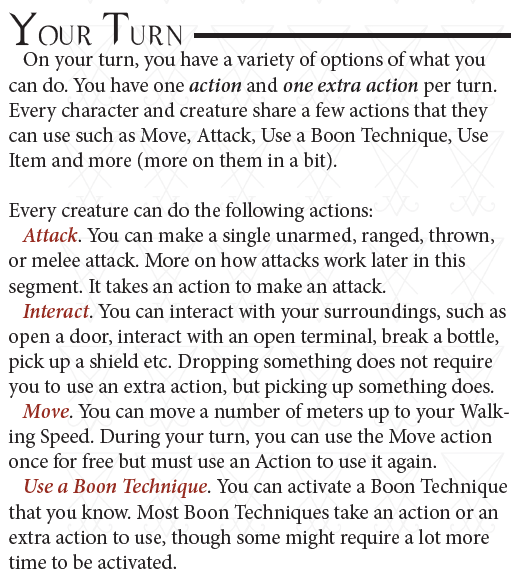 The second image – a direct continuation from the text where it ends after “Use a Boon Technique” – suggests all interactions with items and the environment take an Extra Action, but then why is it not included under the “Interact” heading? I suspect there was actually another heading here that was forgotten: a “Use an Item” heading in red text, but it’s missing. You just have this trailing paragraph that technically is under the “Use a Boon Technique” heading, but because it comes at the top of the next column, it appears as its own, unlabeled heading.