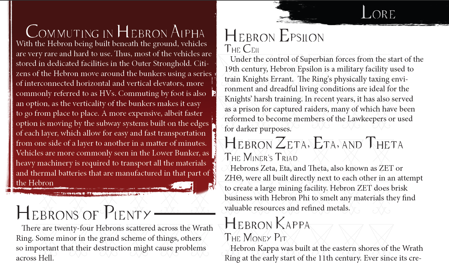 The layout and eye-catching quality of the book is exceptional. Hellborn provides the feeling of hell with dark reds, blacks, greys, and whites to paint the canvas of the game. It feels like a high-quality product put out by a big studio.