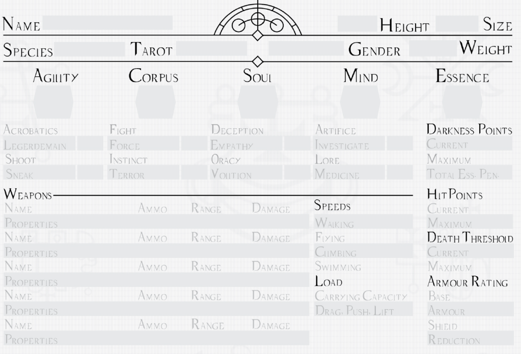 There are some things I find odd about the character sheet, however, like stats that probably don’t need to be there and things that should be, but are missing. For instance: Gender, Height, and Weight; are these necessary? In mechanics, are they really adding to the game or the characters? Does the player need to be reminded of them whenever they sit down to play the game? Will they forget that “Azura” their “Fallen Angel” is heavy set or tall? Is it important for play?